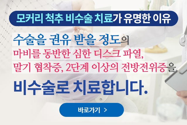 한의사가 직접 허리 주변의 경직된 근육을 부드럽게 풀어주어 주변 근육 및 인대의 기능을 회복, 강화시키는 효과가 있습니다. 모커리 이완추나는 단순 목, 허리통증 환자 뿐 아니라 파열된 디스크, 말기 척추관협착증, 2단계 이상 밀려나간 척추전방전위증 등의 고난도 퇴행성 척추질환 환자도 치료가 가능하며, 그 치료 효과를 SCI급 논문 발표를 통해 객관적으로 검증 받았습니다.